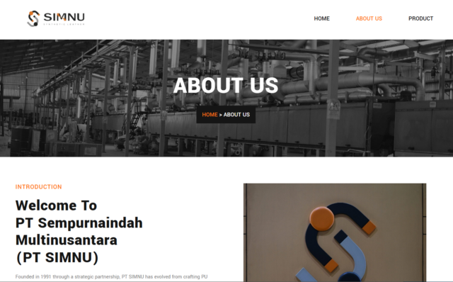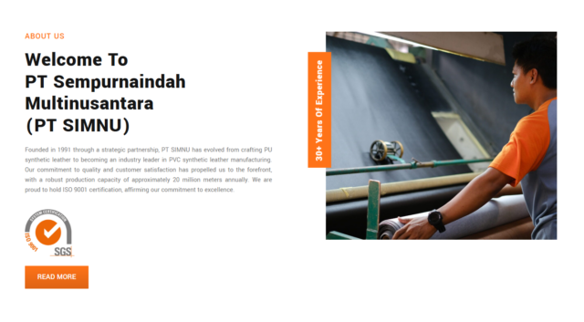 PT SIMNU (Sempurnaindah Multinusantara) is an established Indonesian manufacturer specializing in synthetic leather (PVC & PU). The company supplies high-quality material solutions across industries such as automotive interiors, furniture upholstery, fashion accessories, and more. With over three decades of experience and an annual production capacity of around 20 million meters, SIMNU emphasizes innovation, stringent quality standards (ISO 9001), and sustainable growth. The website prominently presents the brand identity, product range, R&D capability, company history, team culture, and contact information.